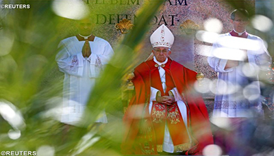 “Este Jesus, que aceita ser aclamado, mesmo sabendo que O espera o «crucifica-o!», não nos pede para O contemplarmos apenas nos quadros, nas fotografias, ou nos vídeos que circulam na rede. Não. Está presente em muitos dos nossos irmãos e irmãs que hoje, sim hoje, padecem tribulações como Ele: sofrem com o trabalho de escravos, sofrem com os dramas familiares, as doenças… Sofrem por causa das guerras e do terrorismo, por causa dos interesses que se movem por trás das armas que não cessam de matar. Homens e mulheres enganados, violados na sua dignidade, descartados…. Jesus está neles, em cada um deles, e com aquele rosto desfigurado, com aquela voz rouca, pede para ser enxergado, reconhecido, amado.”