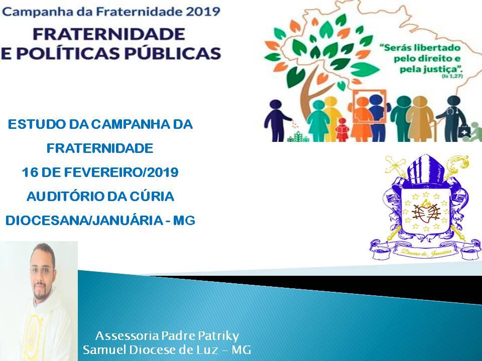 Acontecerá no próximo sábado, 16 de fevereiro, no Auditório da Mitra Diocesana, em Januária/MG, o encontro sobre a Campanha da Fraternidade 2019, cujo tema é Fraternidade e Políticas Públicas e o Lema “Serás libertado pelo direito e pela justiça” (Is 1, 27).