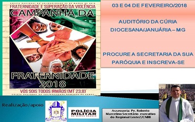 Através deste questionário serão levantados os direcionamentos para o encontro de formação da Campanha da Fraternidade a ser realizado no Auditório da Cúria Diocesana, nos dias 03 e 04 de fevereiro. O encontro será assessorado pelo Pe. Roberto Marcelino, Secretário executivo do Regional Leste II da CNBB. Procure a Secretaria Paroquial e faça já sua inscrição.