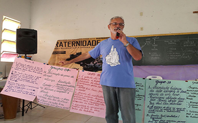 Ele tem a palavra fácil, franca, bem acessível. Ele é muito cativante e o encontro não está sendo cansativo. A animação está por conta das crianças da Comunidade Divino Espírito Santo, da Paróquia Nossa Senhora das Dores.