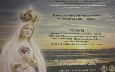 A comunidade Vila Sebastião Lima – Fabião I convida a todos para participar da novena e festejos em honra a sua padroeira: Nossa Senhora de Fátima.