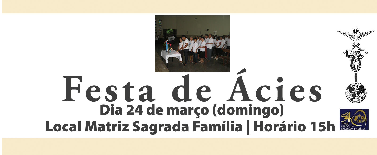 A Festa de Ácies da Legião de Maria acontecerá no próximo domingo, dia 24/03, às 15h, na Matriz Sagrada Família.