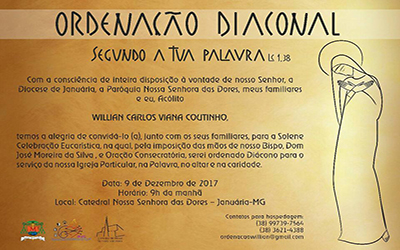 Com muita alegria avisamos que no próximo sábado, dia 09 de dezembro, acontecerá a Ordenação Diaconal do Seminarista William Coutinho.