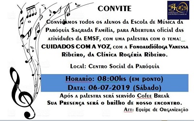 Convidamos todos os alunos da Escola de Música da Paróquia Sagrada Família, bem como os leitores e músicos dos Ministérios que atuam em nossas celebrações para uma palestra com a fonoaudióloga Vanessa Ribeiro.