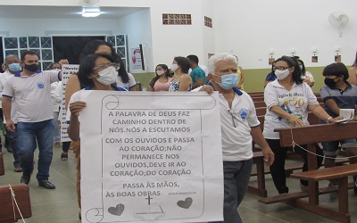 “Hoje nós celebramos o dia da Palavra de Deus, da Bíblia Sagrada. A Bíblia Sagrada que deve orientar a nossa vida, que deve ser o caminho que nós devemos seguir. O caminho que ela nos indica a seguir, que é o próprio Jesus Cristo como caminho, verdade e vida. A Bíblia Sagrada tem o Antigo Testamento, que é a preparação para a chegada do Messias e o Novo Testamento, que vai contar a chegada do Messias, a entrada de Jesus na história da humanidade. Vai contar a história de Jesus até quando ele começa a missão dele e escolhe doze homens para ajudar a Ele na missão. Jesus vai evangelizar esses homens e dar a missão para eles evangelizarem também.”