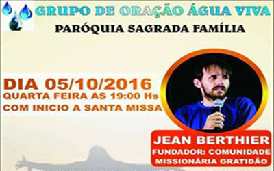 O Grupo de Oração Água Viva convida a todos para participar de sua Reunião de Oração na próxima quarta-feira. Após a Santa Missa, começará o Grupo de Oração que contará com a presença de Jean Berthier, fundador da comunidade missionária Gratidão.