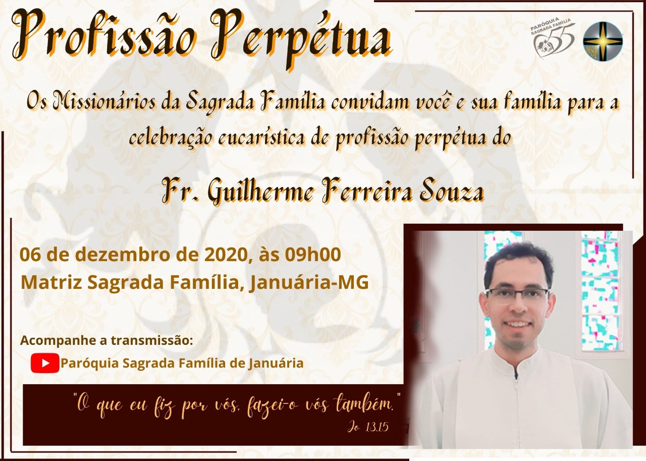 A nossa Paróquia Sagrada Família se alegra pela Profissão Perpétua do Ir. Guilherme, dia 06 de dezembro, domingo, às 09h, na Igreja Matriz.