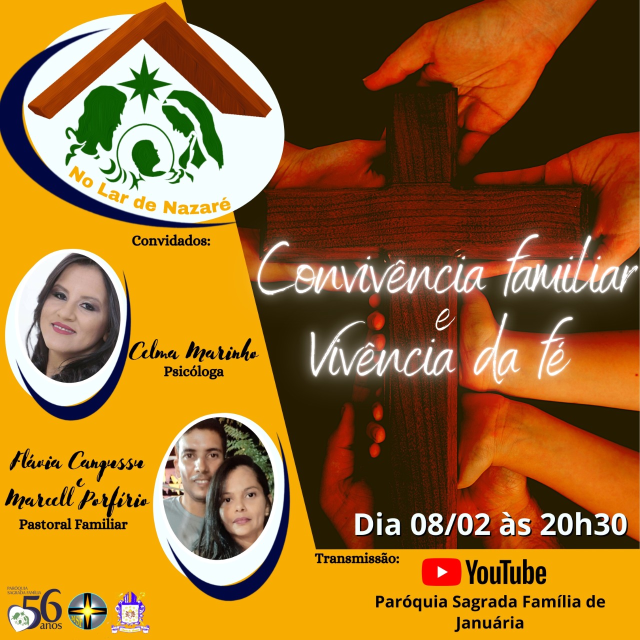 Será abordado o tema “Convivência Familiar e Vivência da Fé”. Participarão a psicóloga Celma Marinho e o casal da Pastoral Familiar Flávia Cangussu e Marcell Porfírio.